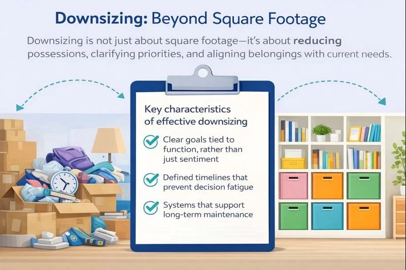 Downsizing is not defined by square footage alone. It includes reducing excess possessions, clarifying priorities, and aligning belongings with current needs. Research in environmental psychology consistently shows that cluttered spaces can increase cognitive load and stress, while organized environments support focus and emotional regulation. For this reason, downsizing is best approached as a gradual, methodical process rather than a single large task.