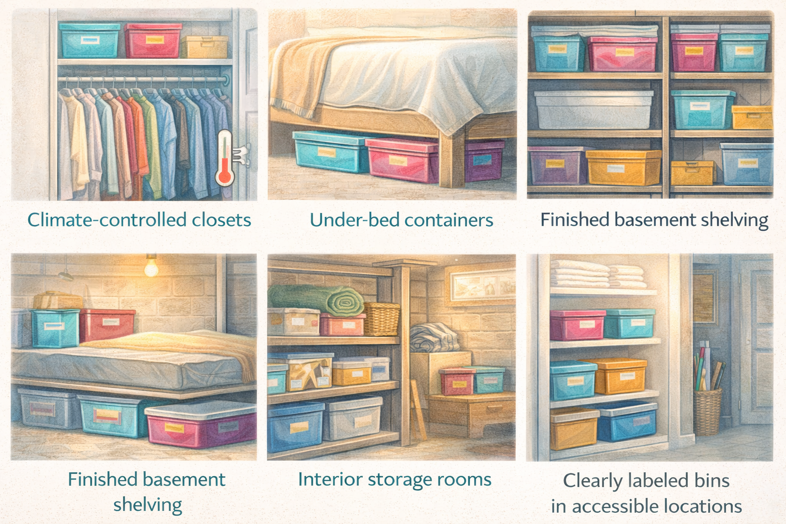 Store instead: Keep these in labeled archival boxes inside a hall closet, filing cabinet, or under-bed storage in a climate-controlled room. Consider scanning important documents for digital backup.