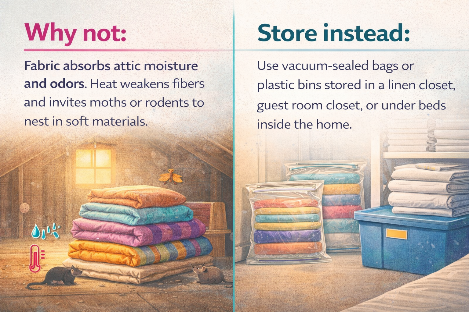 Why not: Fabric absorbs attic moisture and odors. Heat weakens fibers and invites moths or rodents to nest in soft materials.