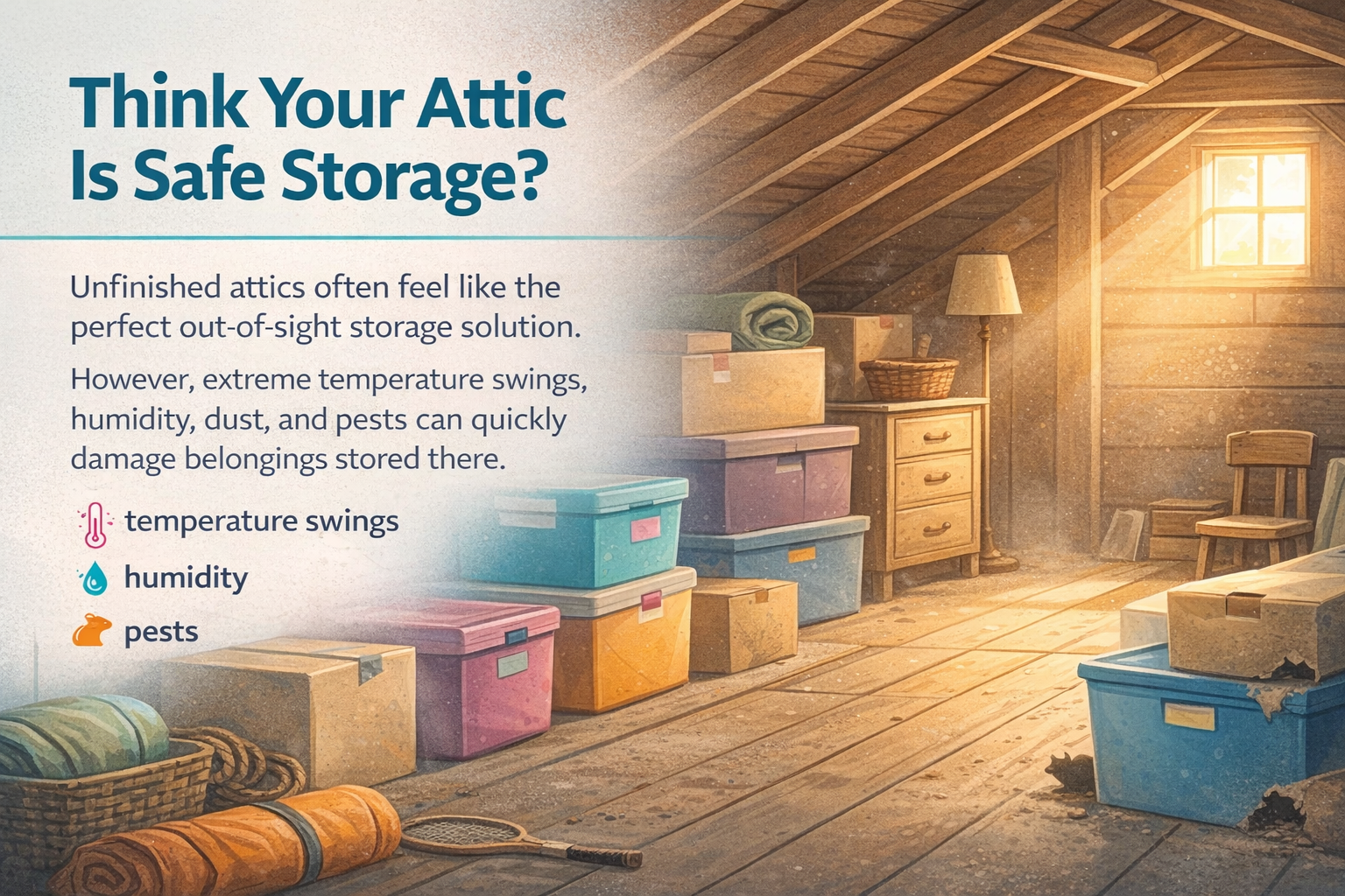 Unfinished attics can work well for certain items — such as empty luggage, artificial trees, labeled plastic bins of non-sensitive seasonal décor, or lightweight household overflow — but only when everything is sealed properly.